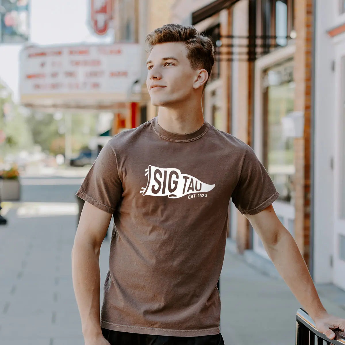 Show off your Sig Tau pride in classic style with this ultra-comfy brown Comfort Colors tee! Featuring a nostalgic pennant design and Sigma Tau Gamma's founding year, this shirt combines timeless fraternity tradition with laid-back, vintage vibes. Perfect for any occasion, from game days to casual hangouts with your brothers.