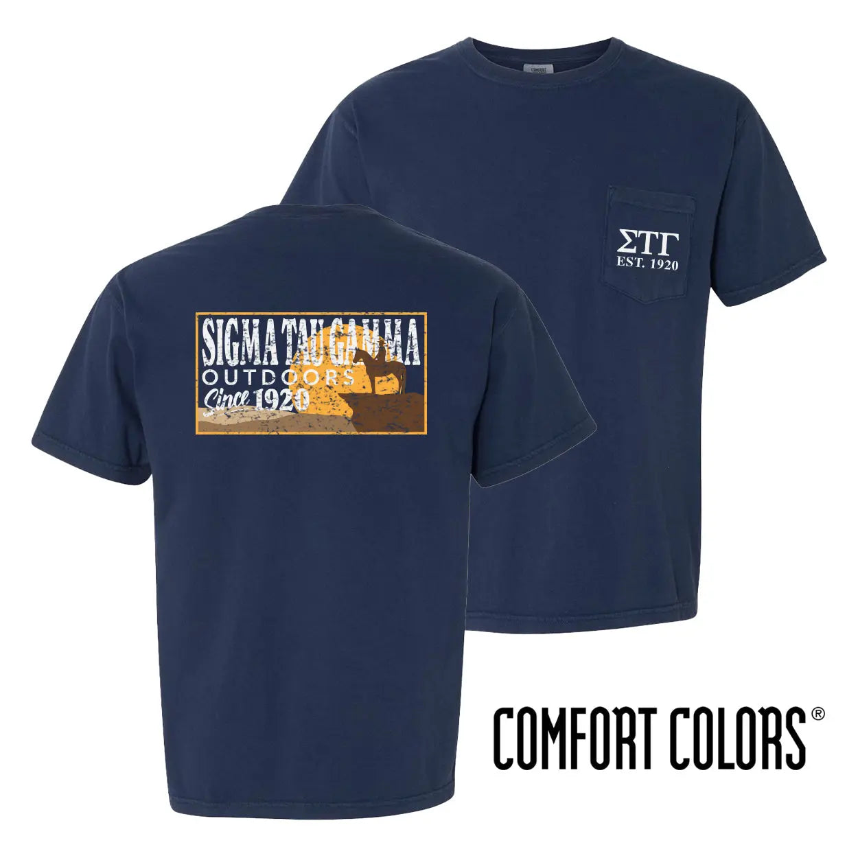 Embrace the spirit of adventure with the Sig Tau Great Outdoors Tee! This navy Comfort Colors short sleeve features a rugged, weathered back design of a cowboy on horseback overlooking rolling hills. The front pocket proudly displays Sigma Tau Gamma's Greek letters and founding year for a classic touch. Made from soft-washed, garment-dyed fabric, this tee offers a relaxed fit perfect for everyday wear or outdoor adventures. Whether you're hitting the trails, traveling, or just repping your fraternity, this officially licensed shirt is a must-have for any brother.