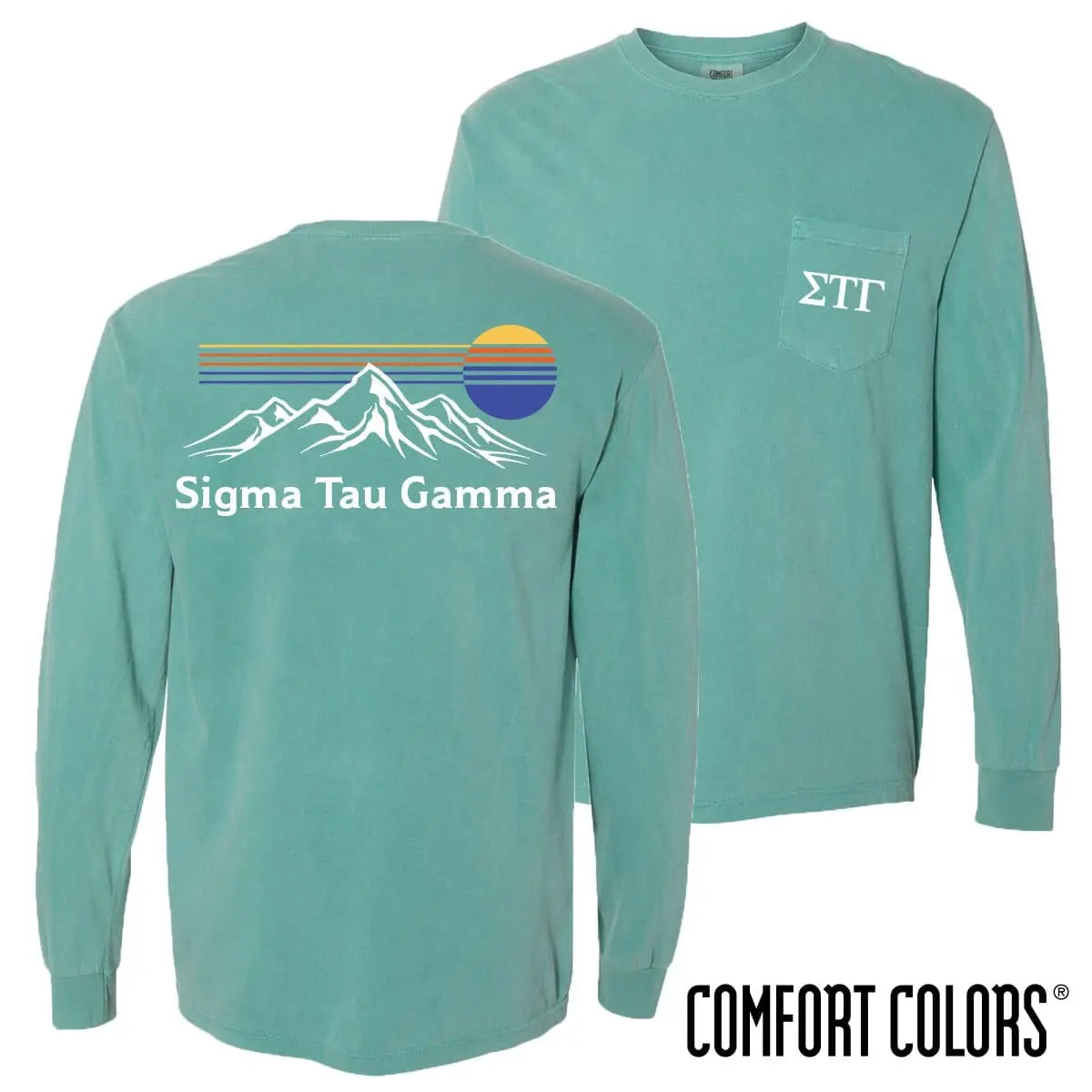 Looking for an adventure? Then our Retro Mountain Comfort Colors Tee would be perfect for you! The front pocket is decorated with Sigma Tau Gamma's greek letters while the back features a mountain ready to be explored. This Sig Tau long sleeve will be your favorite Comfort Colors tee made with its pre-shrunk 100% ringspun cotton.